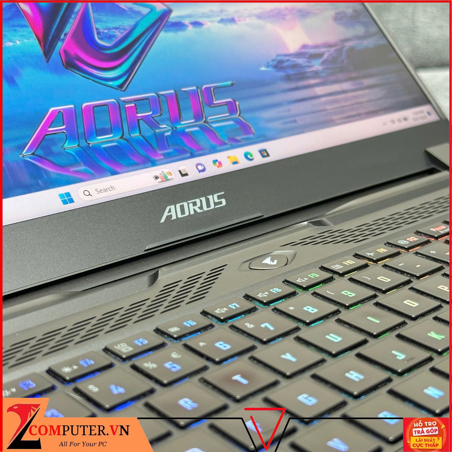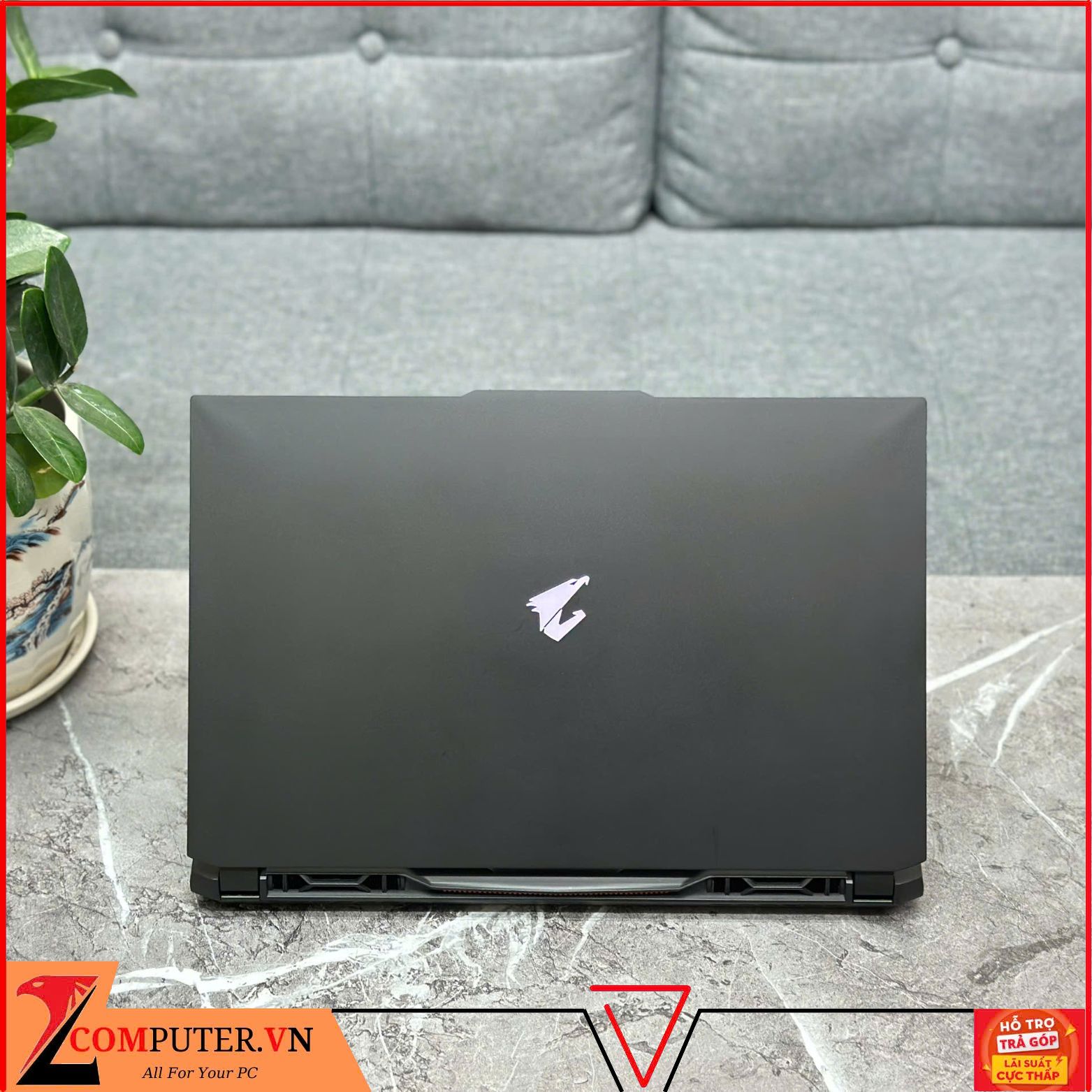 Mặt A được thiết kế bóng bẩy, mượt mà với lớp sơn đen mịn không bám bụi, ở giữa là logo của AORUS được trang bị đèn LED trắng đậm chất của một chiếc máy gaming.